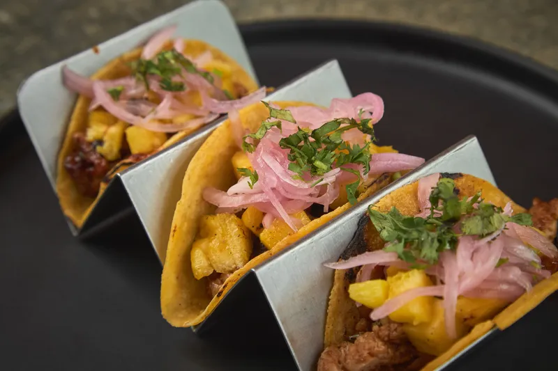 Tortilla de maíz con cerdo al pastor y piña parrillada, con encurtido de cebolla morada y sour cream.